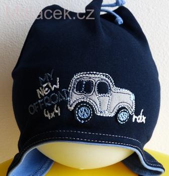 Bavlněná dvouvrstvá zavazovací čepice pro období jara či podzimu z bavlněného úpletu. Motiv offroadu pro nejmenší chlapečky.