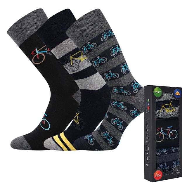 Dárkové balení ponožek pro milovníky kol a cyklistiky DEBOX značky Lonka® od českého výrobce Boma Voxx. Slabé ponožky jsou balené v dárkové krabičce po 3 párech, které se k sobě hodí a ladí. Vtipné ponožky jsou ideální dárek!