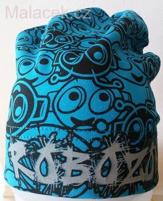 Delší bavlněná čepice jednovrstvá pro období jara či podzimu z bavlněného úpletu. Čepice ala skřítek. Motiv ROBOZONA.