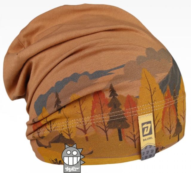 Čepice s podzimním motivem od českého výrobce Dráče. Tenká bavlněná spadlá čepice moderního střihu na jaro a podzim, zdobená tištěným motivem.