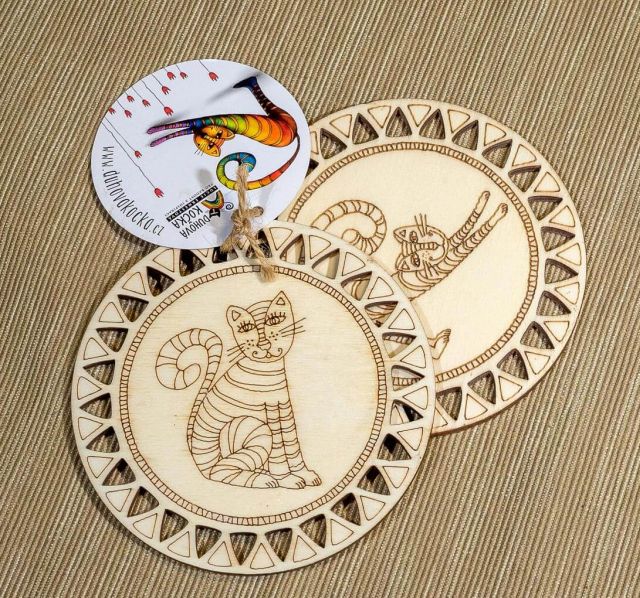 Krásné podložky pod hrníček - nejen pro milovníky koček. Sada 2 kusů tenkých překližkových podložek pod hrneček s gravírovaným motivem kočky.