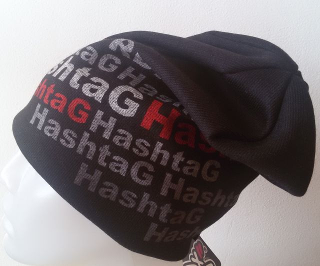 Spadlá zimní pletená čepice, tisk HashtaG. Cca třetina čepice - oblast čela a o něco výše je podšitá fleecem.